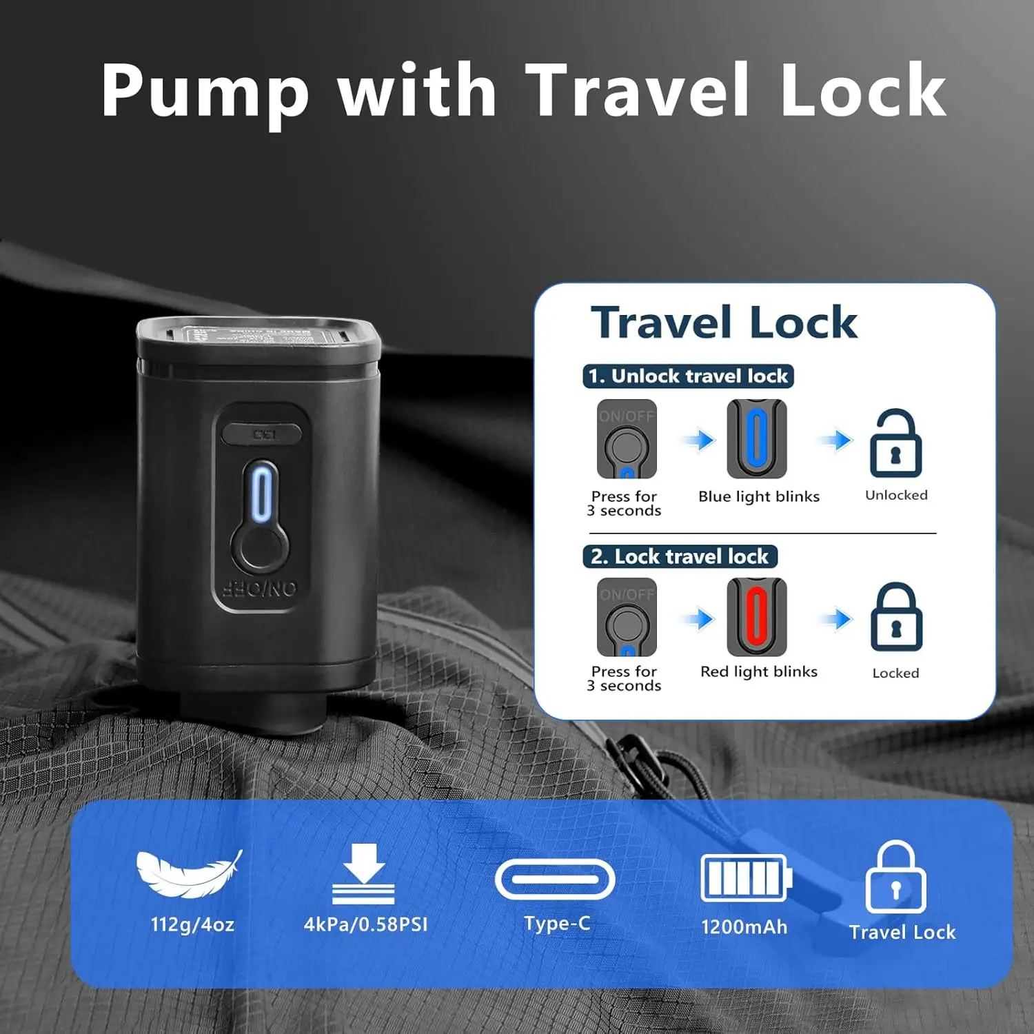 - [Tiny Wireless Pump with Travel Lock]The 3.9oz fist-sized pump (1200mAh battery), lasts 20 uses per charge. The travel lock design prevents accidental activation. Press and hold the power button for 3 seconds to unlock before use. The blue light will flash, indicating it is ready for operation. The blue light will flash, indicating it’s ready to operate. !!!Note: Contains batteries, cannot be checked in baggage, carry-on only.
